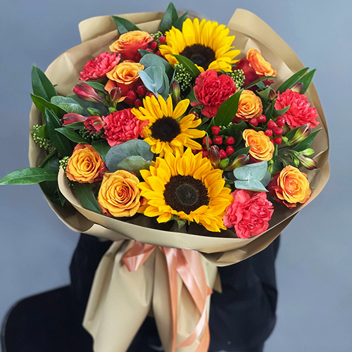 Букет "Ричи" из подсолнухов, альстромерий, гиперикума, роз, скиммии и диантусов