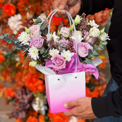 Стильная композиция в сумочке из роз, хризантем и эустом